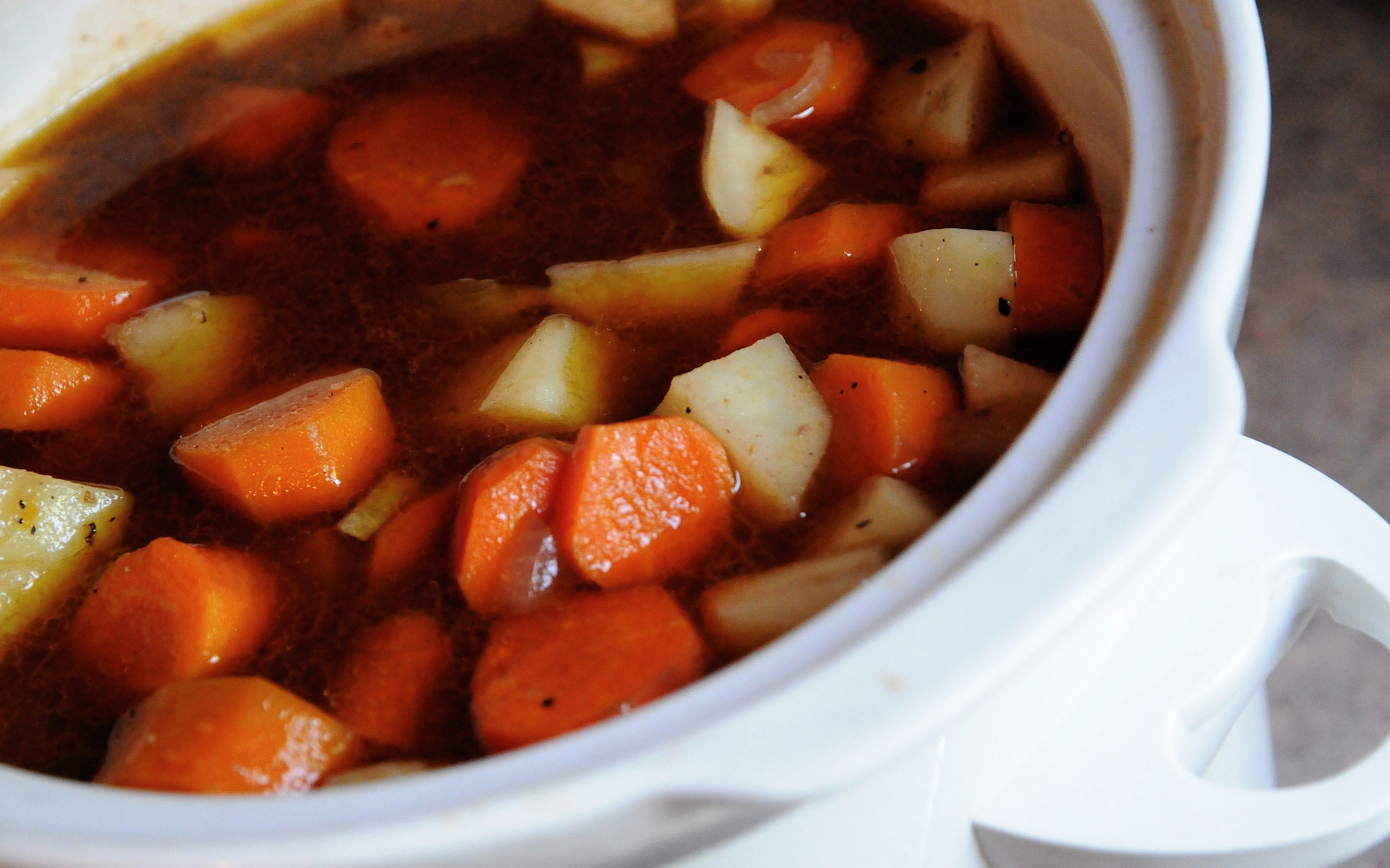 - Add the vegetables to the slow cooker after the meat has cooked for an hour. Stir, cover and continue cooking until meat and vegetables are tender for 1.5 – 2 hours. Remove the lid to thicken if needed.